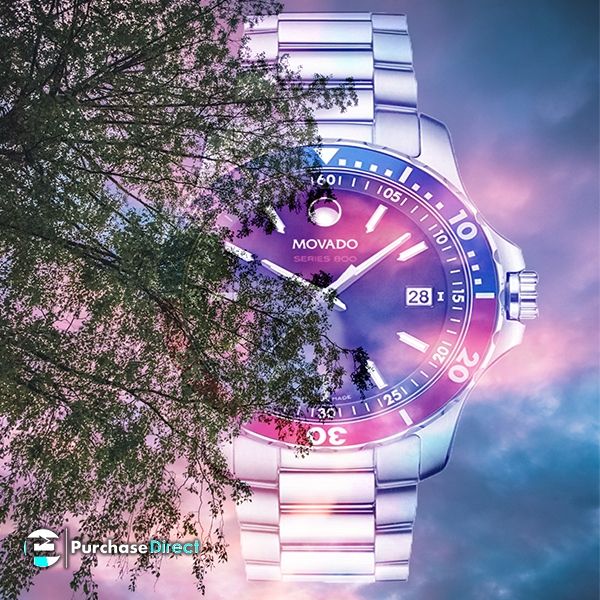 Stainless steel case with a stainless steel bracelet. Uni-directional rotating stainless steel bezel with a blue and red (Pepsi) aluminum ring. Black dial with luminous silver-tone hands and index hour markers. Minute markers around the outer rim. The Movado dot appears at the 12 o'clock position . Dial Type: Analog. Luminescent hands and markers. Date display at the 3 o'clock position. Quartz movement.