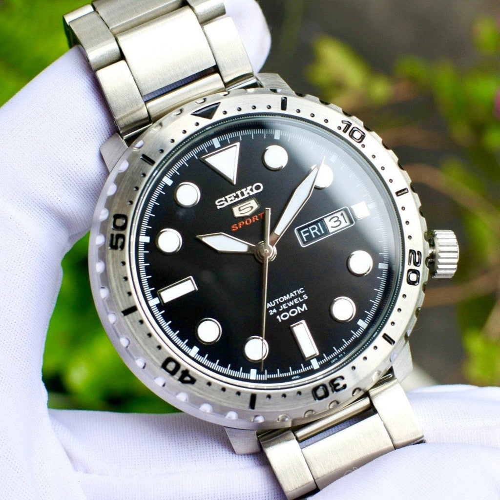 Scratch resistant Hardlex crystal. Pull / push crown. Solid case back. Round case shape. Case size: 45 mm. Case thickness: 13 mm. Band width: 20 mm. Fold over clasp. Water resistant at 100 meters / 330 feet. Functions: date, day, hour, minute, second. Sport watch style. Watch label: Japan Movt. Seiko 5 Sports Automatic Black Dial Men's Watch SRPC61J1.