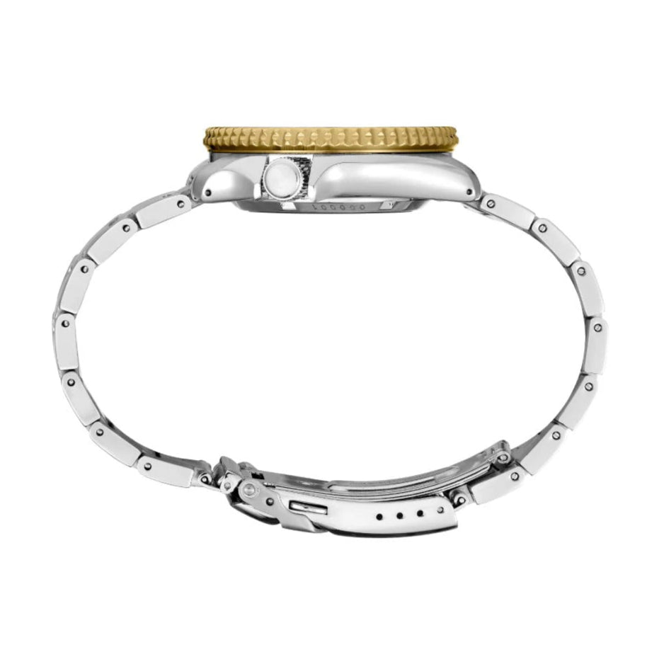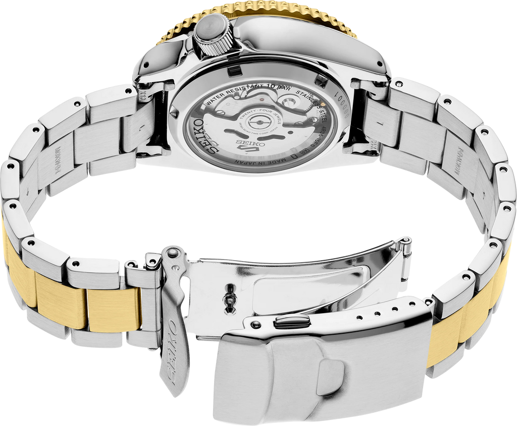 The Seiko 5 Sports SRPK24 is a special edition for the American market, combining elegance and robustness. Its 42.5 mm diameter stainless steel case features a two-tone finish, combining silver-tone steel with gold accents. The unidirectional gold-tone bezel frames a brown sunburst dial, providing remarkable visual depth. Luminescent hands and hour markers ensure optimal readability, even in low-light conditions.
