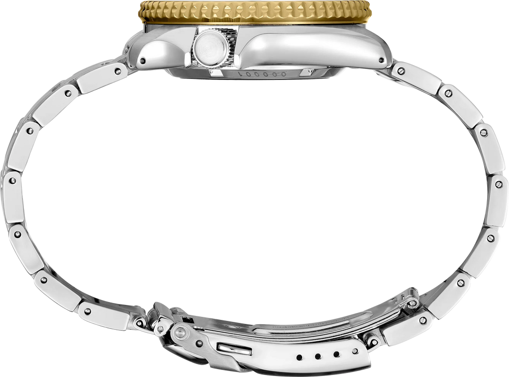 Framed by a gold uni-directional rotating elapsed timing bezel, the sunray-finish brown dial features luminous hands and markers, and a date/day calendar. Crafted of stainless steel in two-tone finish, this exceptional watch includes a tri-fold push button release clasp with lock, as well as a screwdown see-through caseback for a view of classic timekeeping in action. 10 bar, 100M Water Resistant.