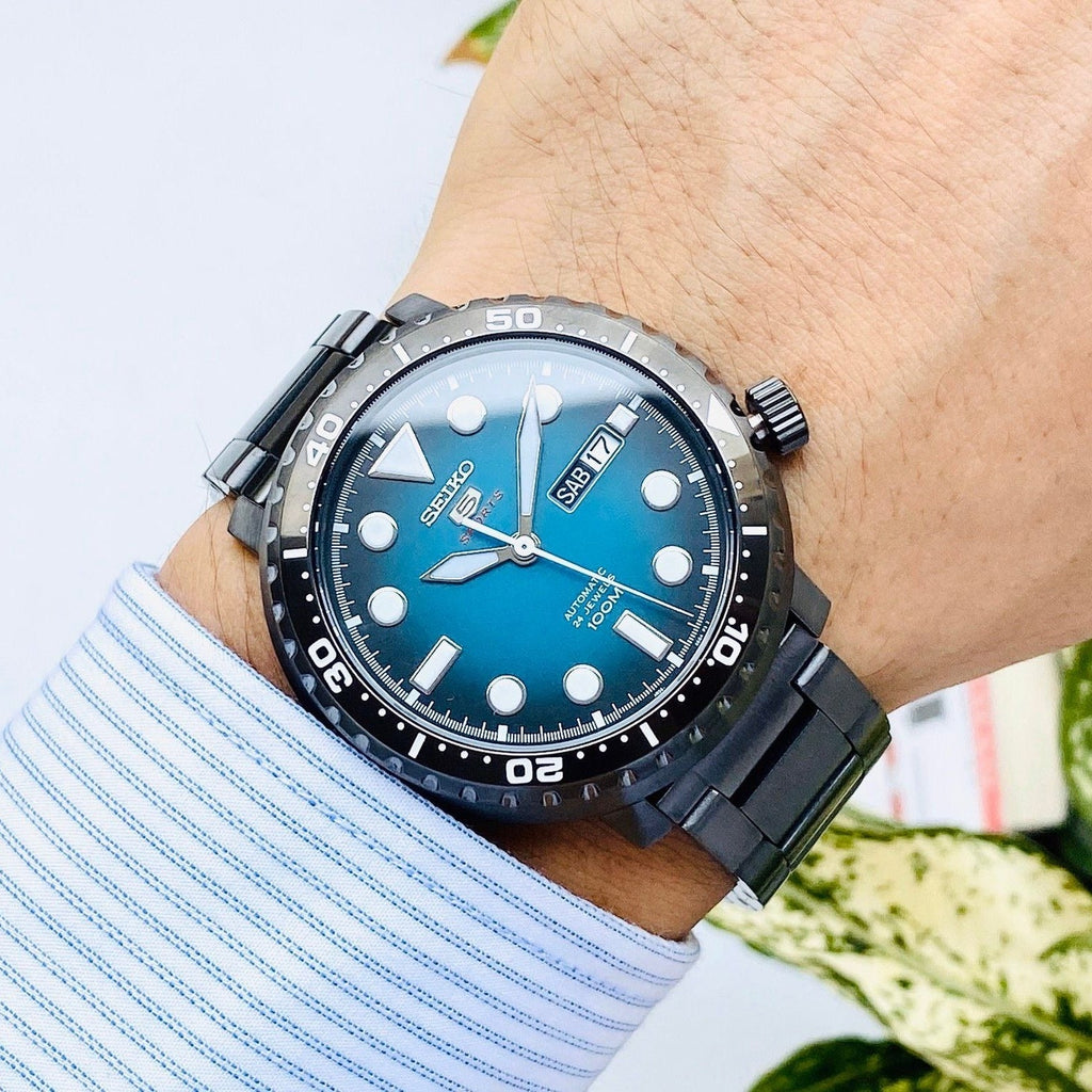 This men’s automatic watch from Seiko features a gradient turquoise and black day and date dial, luminous hands and hour markers, and a black tone rotational bezel. Black tone stainless steel houses Seiko’s Calibre 4R36 automatic movement with a water resistance of 100m and 24 jewels. This made in Japan watch is outfitted with black IP stainless steel bracelet for a timeless classic appearance.