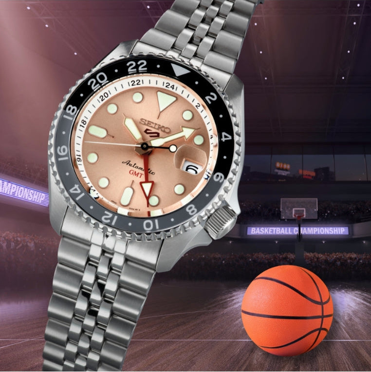 The Seiko 5 Sports GMT The Slamdunk of Style Series SSK043K1 is a limited-edition timepiece that celebrates the spirit of basketball. This watch combines the iconic Seiko 5 Sports design with a vibrant champagne dial and a GMT function, making it a must-have for both watch enthusiasts and basketball fans.