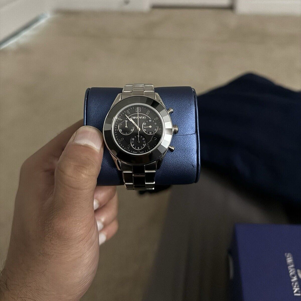 The perfect balance between tradition and innovation, the Octea Lux Sport 39mm is a modern and luxurious watch. Crafted in stainless steel, it features a stylish black sunray dial with crystal indexes, three dials and a date window. The ultra-chic black crystal bezel, exclusive to the line, and a three-link metal bracelet complete this distinctive design. The watch is water resistant to 50m and is Swiss made.Women's chronograph watch from Swarovski from the octea lux sport collection. Octea lux sport watch, metal bracelet, black, stainless steel case size: 39 mm, watch strap length: 16. 5 cm. Octea lux sport 39 mm is a modern and luxurious watch, the perfect synthesis of innovation and tradition. Made of stainless steel, it features an elegant black dial with a sunray pattern, crystal indexes, three counters and a date window. The ultra-chic black crystal bezel, made exclusively for this line, together with a three-link metal bracelet complete the extraordinary design. The swiss made watch is water resistant up to 50 m.