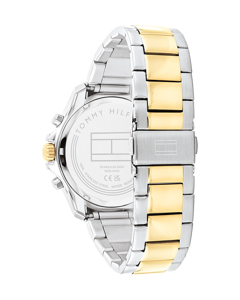 Tommy Hilfiger men's watch from the Jordon collection has a round stainless steel case and a two tone bracelet with a black dial and a black bazel featuring a multi-dial display presenting date and 24-hour time information. Power is generated by the quartz movement.