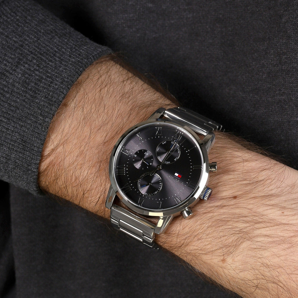 Introducing the Tommy Hilfiger Kane Chronograph Watch for Men - 1791397. Crafted with a striking grey dial and silver steel strap, this watch is designed to elevate any outfit. Equipped with a chronograph feature, it allows for precise timekeeping. Perfect for the modern man who values both style and functionality.