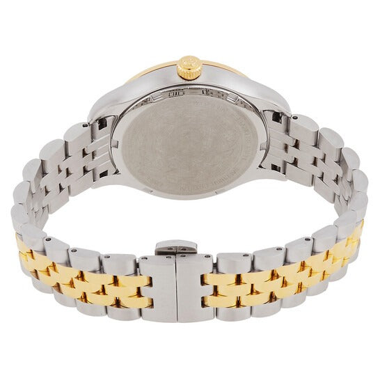 Blue dial enhanced by gold-tone hands. Silver-tone stainless steel case with a two-tone (silver-tone and gold-tone) stainless steel band. Quartz movement. 50 meters / 165 feet water resistance. Fixed bezel. Scratch Resistant Sapphire crystal. Solid caseback. Deployment with Push Button Release clasp. Pull / Push crown. Case size 35 mm. Versace VE2S00522 Hellenyium Watch.