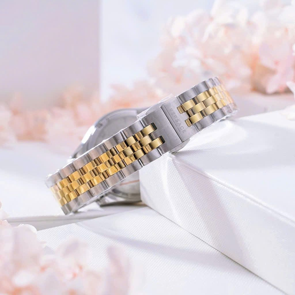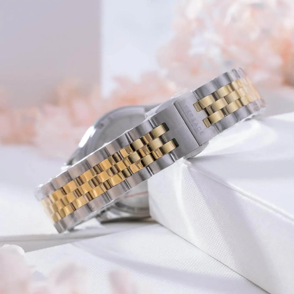 Elevate your style with the Versace Hellenyium Quartz watch, designed exclusively for women. Featuring a striking blue dial and a sophisticated two-tone steel strap, this timepiece combines luxury with durability. Its precise quartz movement ensures reliable timekeeping, while the elegant design complements both casual and formal looks. Make a statement of timeless elegance and refined taste with this exquisite Versace watch.