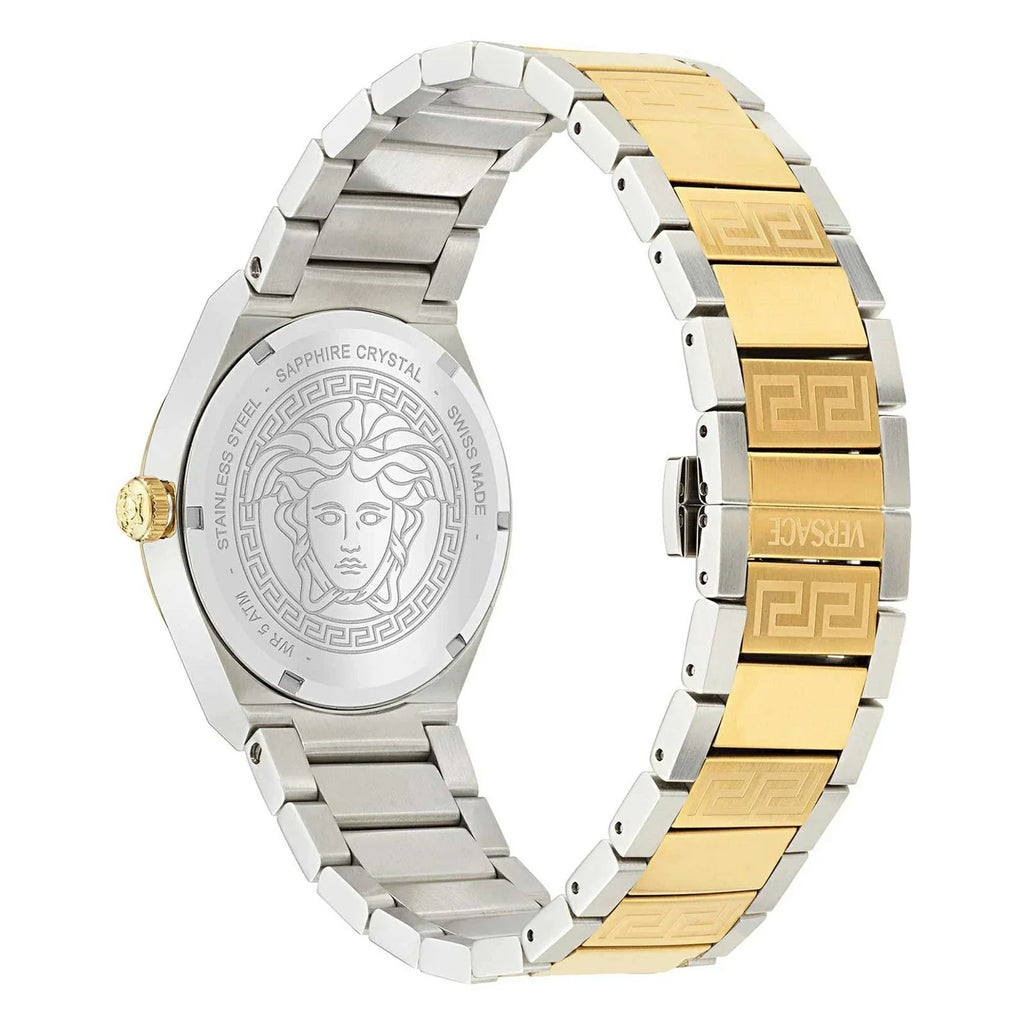 Elevate your style with the Versace V-AURIA VE0F00425. This stunning 39mm quartz watch features a luxurious silver-gray and gold steel bracelet, sapphire crystal, and a sophisticated butterfly clasp. Water-resistant up to 5 ATM, it's perfect for the modern man