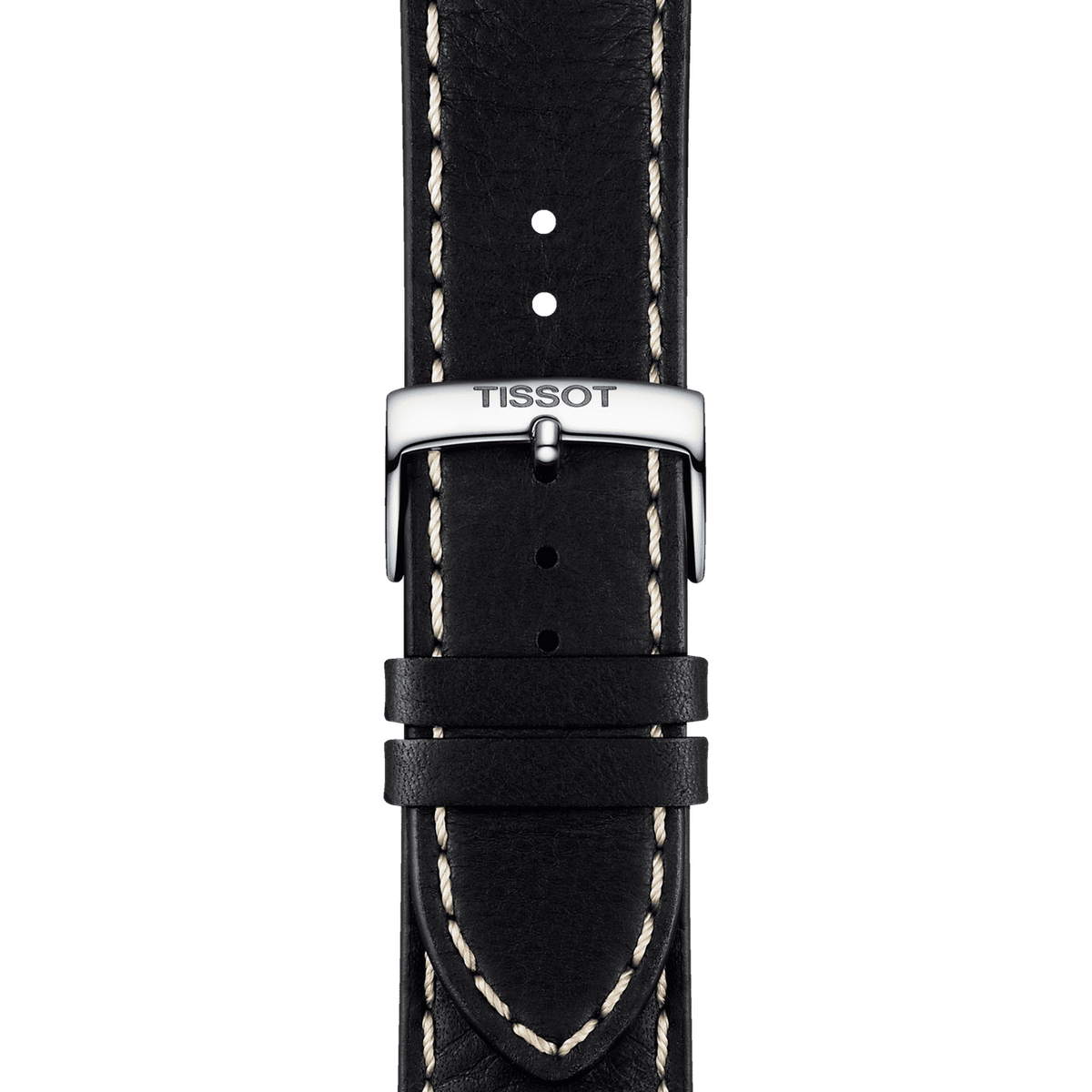 316L stainless steel case with a black leather strap. Fixed stainless steel bezel. Black dial with luminous silver-tone hands and index hour markers. Minute markers around the outer rim. Dial Type: Analog. Luminescent hands and markers. Date display between 4 and 5 o'clock position. Chronograph - three sub-dials displaying: 60 second, 30 minute and 1/10th of a second. ETA caliber G10.212 quartz movement. Scratch resistant sapphire crystal. Pull / push crown. Solid case back. Round case shape. Case size: 44 mm. Case thickness: 11.1 mm. Band width: 22 mm. Tang clasp. Water resistant at 100 meters / 330 feet. Functions: chronograph, rattrapante, date, hour, minute, small second. PR100 Series. Sport watch style. Watch label: Swiss Made. Tissot PR100 Chronograph Quartz Black Dial Men's Watch T101.617.16.051.00.