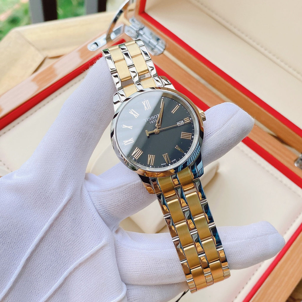 Brand New Authentic Tissot T-Classic Classic Dream Two Tone Men's Fashion Watch Model T033.410.22.053.01. Stainless Steel case with Two-Tone Stainless Steel watch band. Deployment with Push Button clasp. Fixed bezel. Dial description: Yellow gold tone hands and Roman Numeral hour markers on a Black dial. Quartz movement. Powered by ETA Caliber 805.112 engine. Watch functions: Date, Hour, Minute, Second. Pull/Push crown. Scratch Resistant Sapphire crystal. Round case shape. Case size: 38mm. Case thickness: 7.4mm. Solid case back. 30 Meters - 100 Feet water resistant. 2 year warranty. Also known as model: T0334102205301, T033-410-22-053-01.