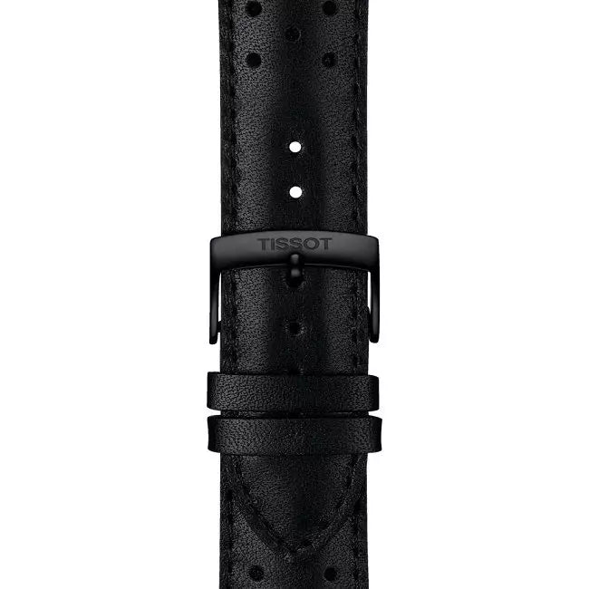 Black dial enhanced by luminous silver-tone hands. Black PVD stainless steel case with a black perforated leather band. Quartz movement. 100 meters / 330 feet water resistance. Fixed bezel. Scratch Resistant Sapphire crystal. Solid caseback. Tang clasp. Case size 42.5 mm x 11.22 mm. Band 20 mm x 8 incheslong. Tissot T106.417.36.051.00 T-Sport V8 Watch.