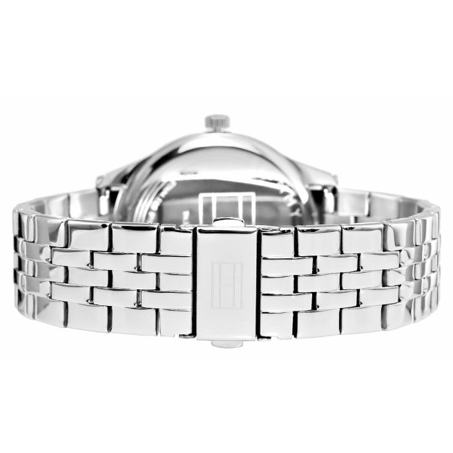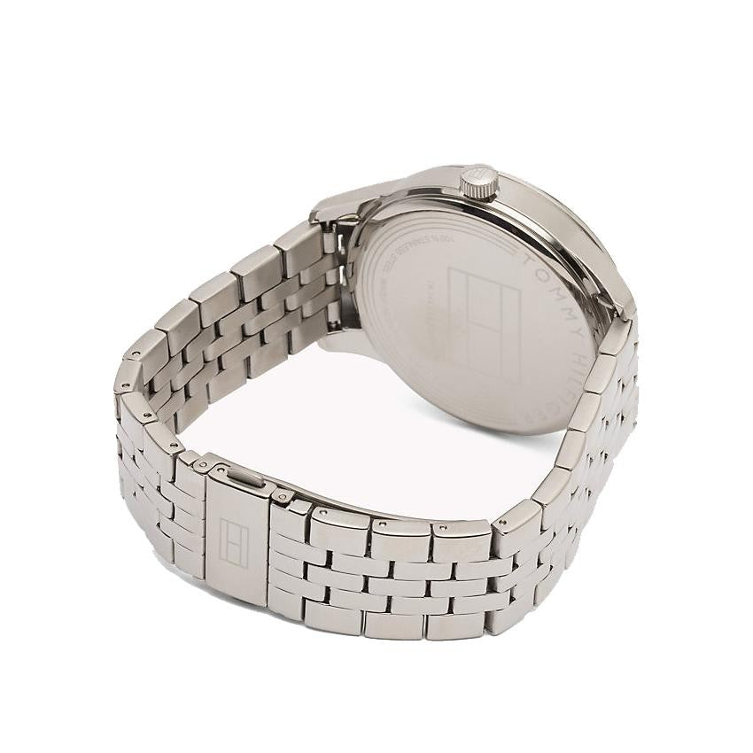 The classic Tommy Hilfiger flag at 12 o'clock adds iconic detailing to this elegant design Quality materials, iconic style: features a 44 mm stainless steel case and link bracelet, Blue dial with Roman index Quartz accuracy: Quartz Movement provides precise timekeeping and minimal maintenance for a reliable and worry-free timepiece Durable mineral crystal: made from glass and protects watch from scratches