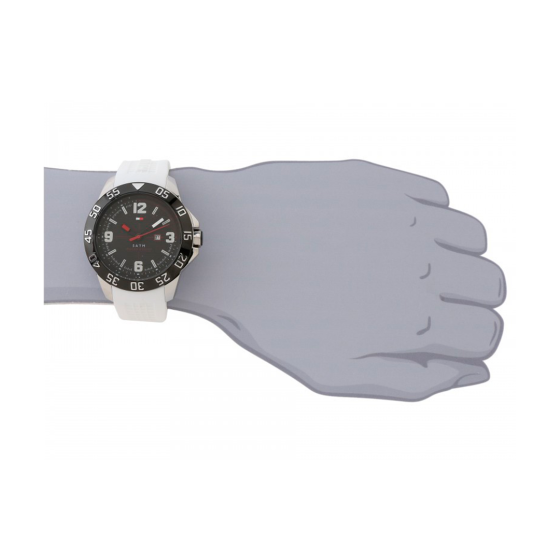 Analog date aperture near three o'clock position, Double-layer matte black dial with striated texture and glossy red/white/navy flag logo applique below twelve o'clock position, Matte white silicone strap with textured grid pattern and polished silver-tone stainless steel buckle,