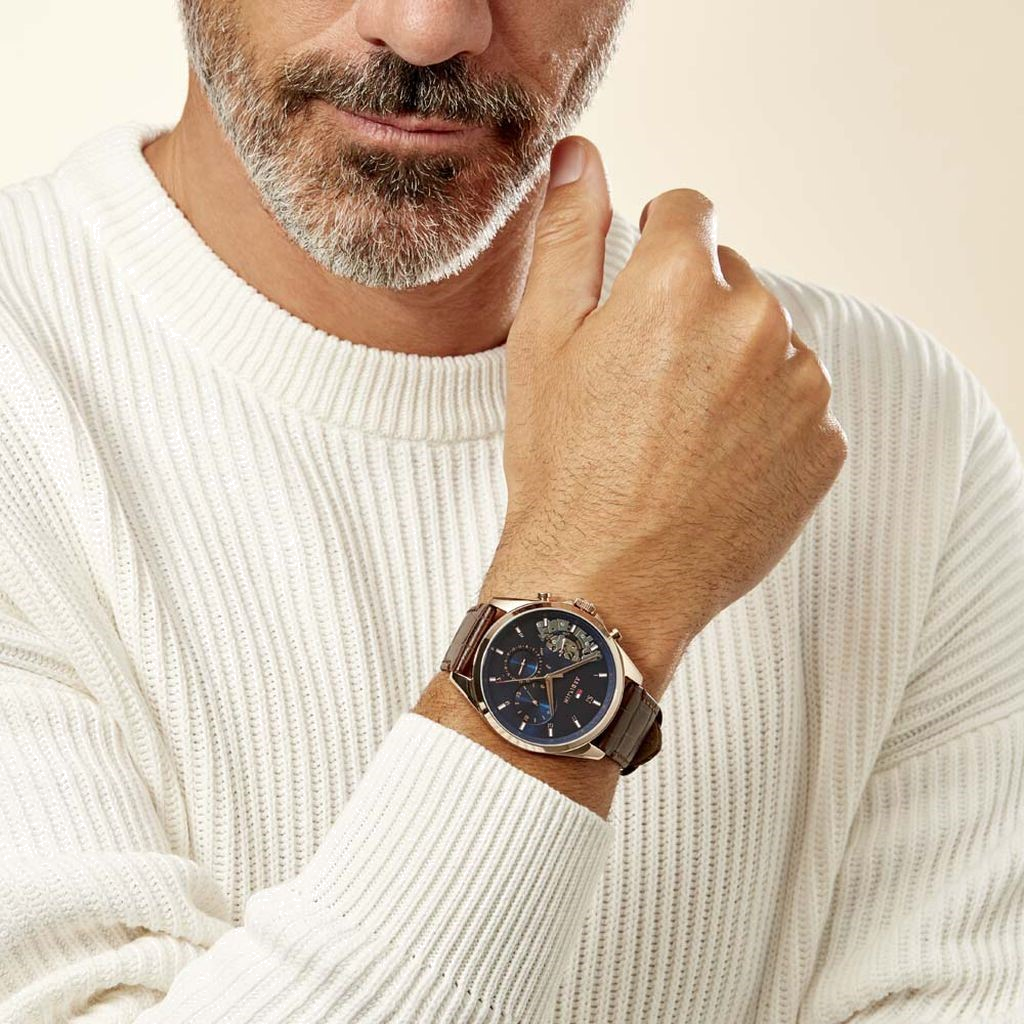 Expertly crafted with a brown leather strap and a blue dial, the Tommy Hilfiger Deacan watch for men is a stylish and reliable timepiece. Featuring precise quartz movement and a durable stainless steel case, this watch is both functional and fashionable. Perfect for the modern man in search of a versatile accessory.