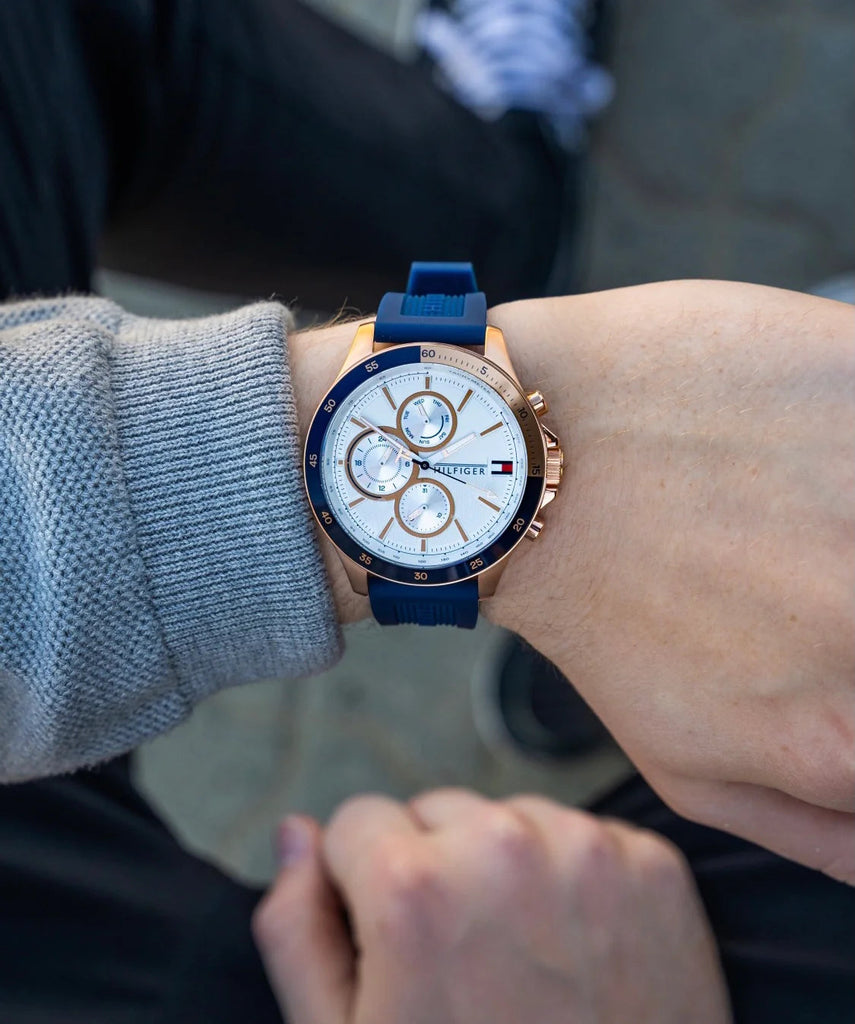 Tommy Hilfiger Bank Multifunction Quartz White Dial Blue Rubber Strap Watch for Men - 1791778