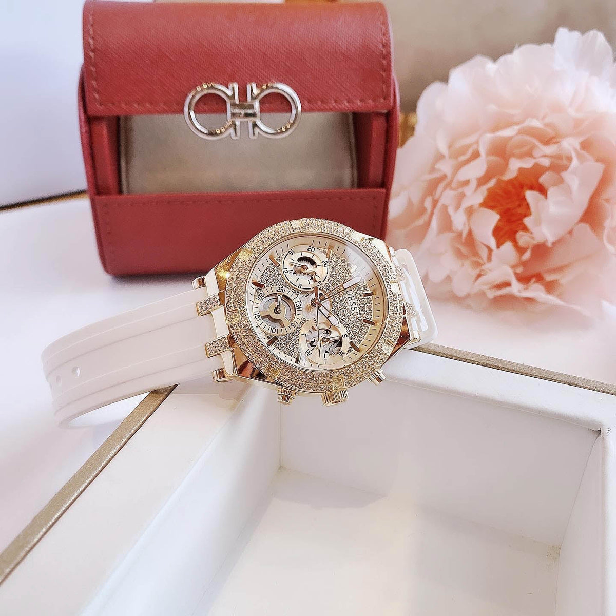 Brand: Guess Product: Watch Color: Gold Case Shape: Round Case Material: Stainless Steel Gender: Womens Movement: Quartz Strap / Bracelet: Silicone Watches Category: Fashion Watches Features: Crystals, Multi-Function Warranty: 1 Year International Case Size: 38 mm Water Resistance: 50 meters