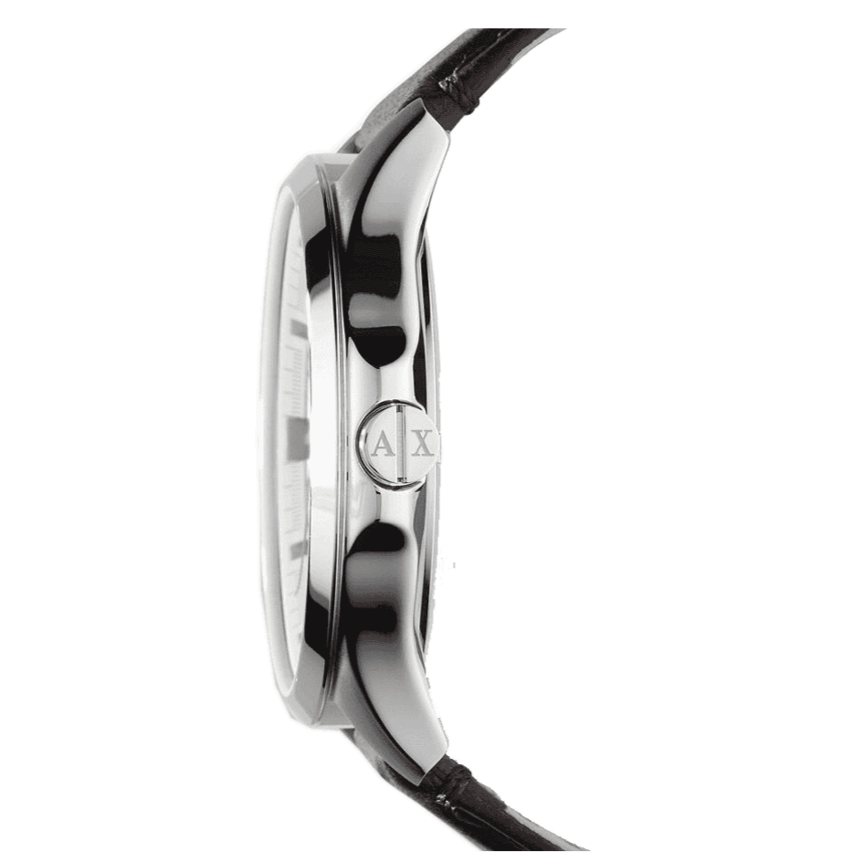 Second Markers: Minute Markers around the rim. The Armani Exchange logo appears at the 12 o'clock position