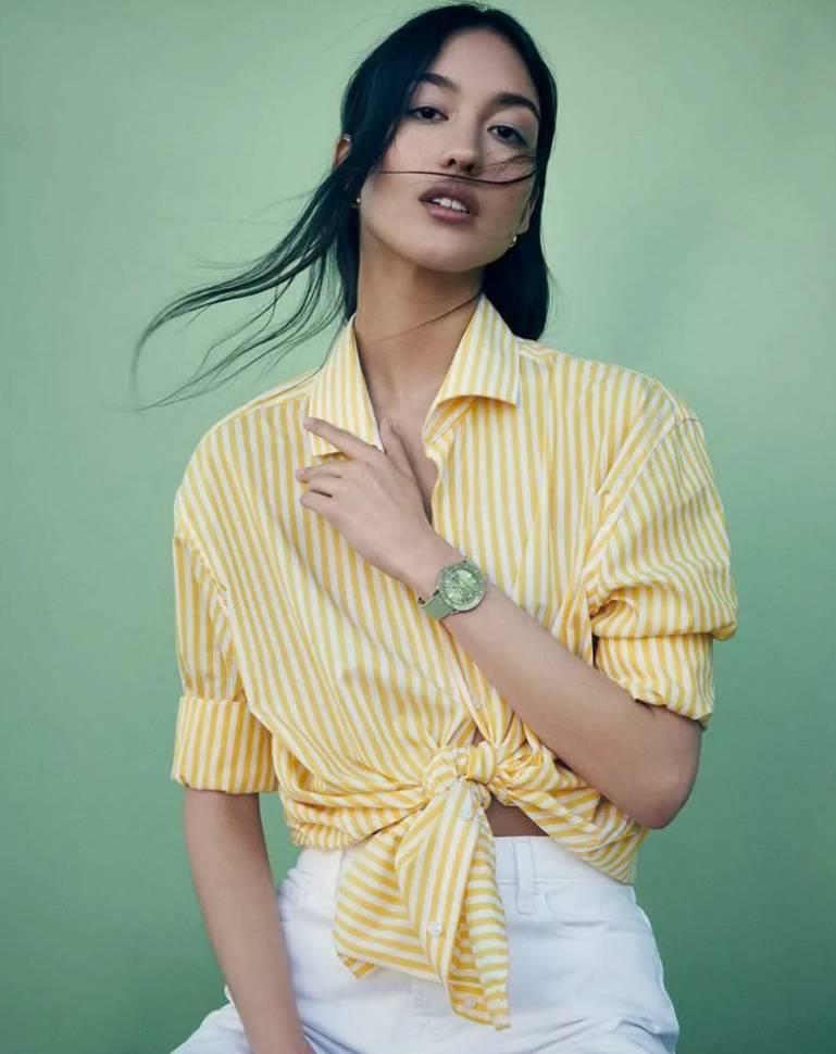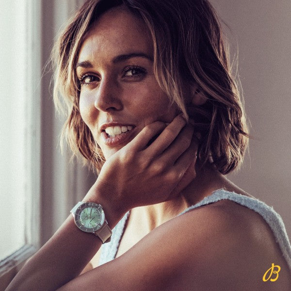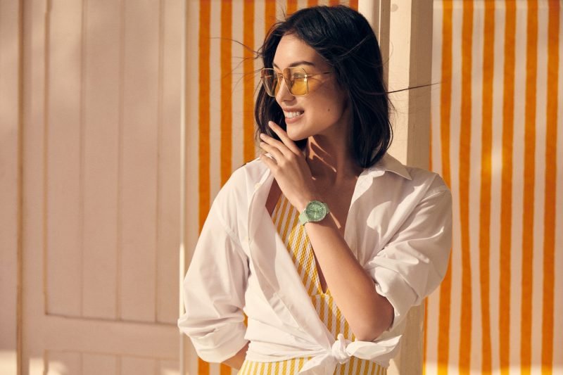 But what started as a neat 1950s divers’ watch has evolved into a sleek and fresh watch with a bit of sass and a lot of versatility. Think playsuits, pink flamingos, and headbands setting off perfectly flipped hair. Imagine a carefree and confident lady enjoying a seaside resort, sporting big sunglasses and swinging a straw handbag. ​