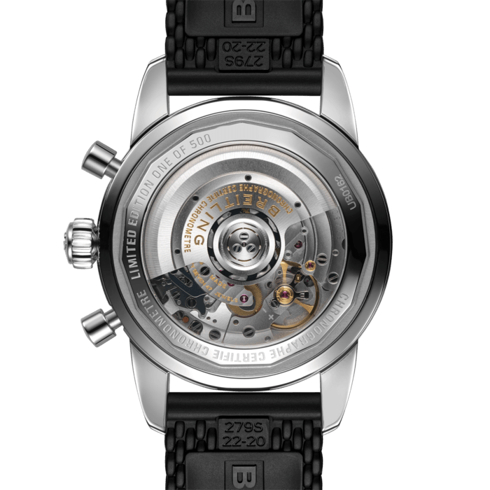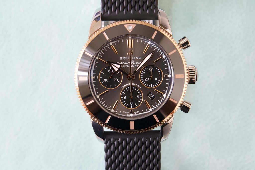 Featuring the iconic triangular-shaped hands as well as a unidirectional bezel with a polished ceramic ring, the Superocean Heritage is an elegant looking diver’s watch. Available here in stainless steel and 18k red gold, this Superocean Heritage B01 Chronograph 44 features a black-eye gray dial. Offered with a “mesh-styled” black rubber strap fitting a folding buckle, this Superocean Heritage is powered by the in-house Breitling Manufacture Caliber 01, a COSC-certified chronometer.