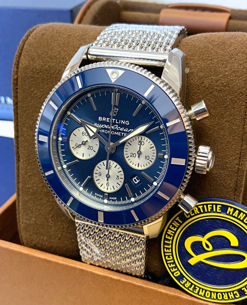 Featuring the iconic triangular-shaped hands as well as a unidirectional bezel with a polished ceramic ring, the Superocean Heritage is an elegant looking diver’s watch. Available in a variety of materials including stainless steel and 18k red gold, the Superocean Heritage B01 Chronograph 44 features a range of black, blue, silver, or green dials. Offered either with a matching mesh bracelet, or a “mesh-styled” rubber strap fitting a folding buckle, this Superocean Heritage is powered by the in-house Breitling Manufacture Caliber 01, a COSC-certified chronometer.