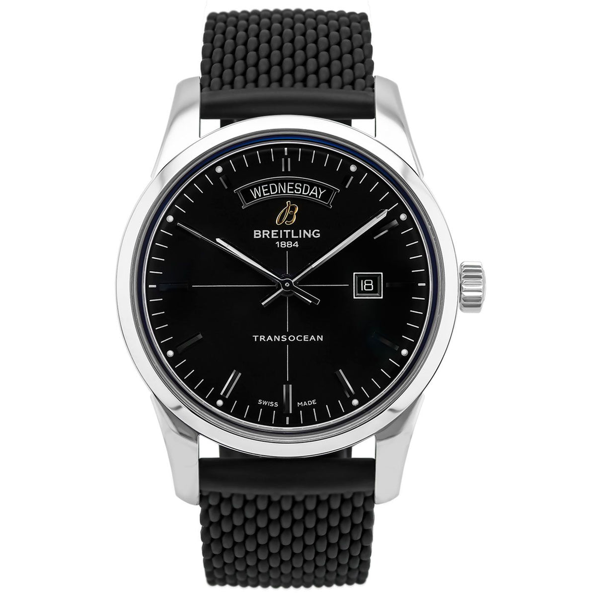 New Breitling Transocean Day & Date A4531012.BB69.278S.A20S.1 - Selfwinding mechanical 43 mm watch, Steel case. Black dial. Black Rubber Aero Classic strap with a pin buckle. Swiss made. Watch comes in original packaging, with set of documents and 2 years warranty