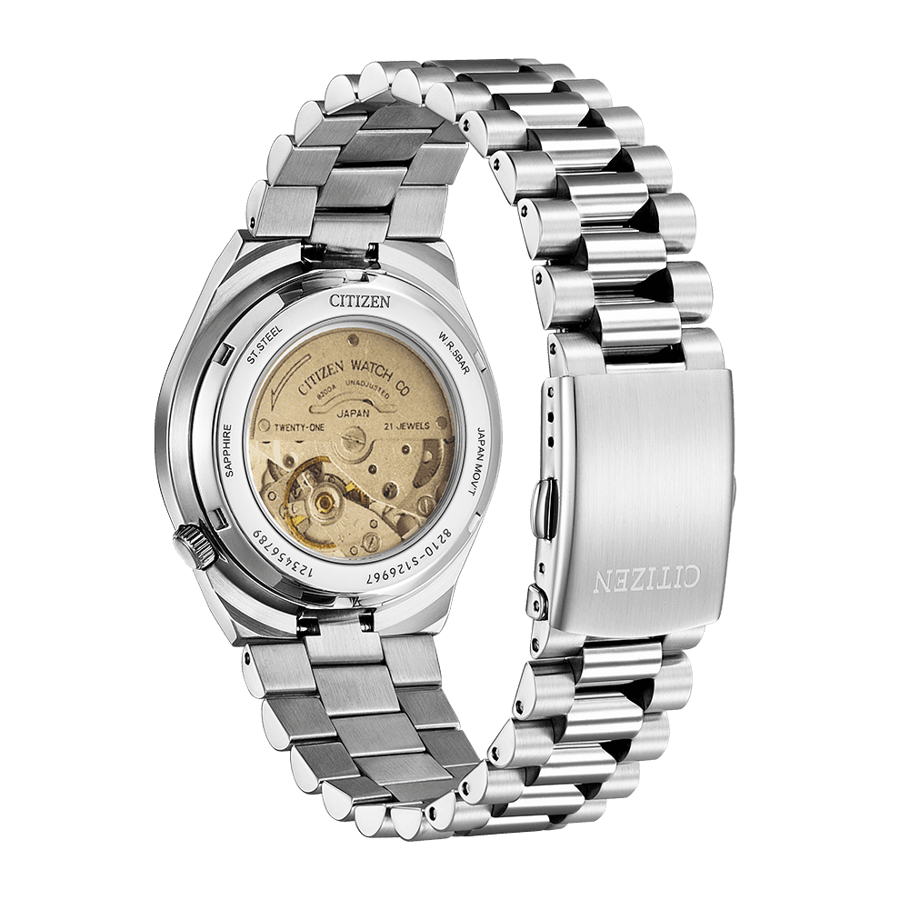 The watch features a date display under a sapphire crystal with a date magnifier, a skeleton case back that reveals the detailed mechanics, and a stainless-steel bracelet with a fold-over clasp and push button for added security. With a water resistance of 5 Bar, it is perfect for daily wear. This piece embodies CITIZEN's dedication to precision, elegance, and quality, making it a fitting choice for those who value both aesthetic beauty and functionality in their timepieces.