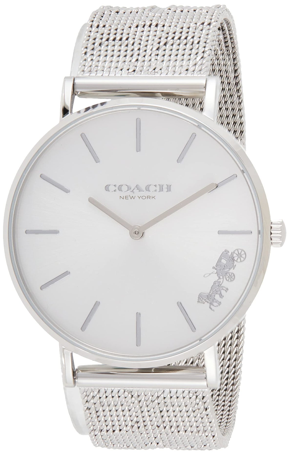Stainless steel case with a stainless steel mesh bracelet. Fixed stainless steel bezel. Silver dial with silver-tone hands and index hour markers. Dial Type: Analog. Quartz movement. Scratch resistant mineral crystal. Pull / push crown. Solid case back. Round case shape. Case size: 36 mm. Case thickness: 7.5 mm. Band width: 18 mm. Fold over slip through clasp. Water resistant at 30 meters / 100 feet. Functions: hour, minute. Perry Series. Casual watch style. Watch label: Swiss Made. Coach Perry Quartz Silver Dial Ladies Watch 14503341.