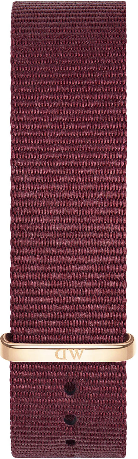 The Daniel Wellington Classic Roselyn 36mm Rose DW00100271 features a ruby red nato strap, a rose gold colored case and a classic eggshell white dial. The watch has a 36mm case width, 6mm thickness and 18mm strap width at the attachment point. Daniel Wellington watches are guaranteed for 2 years and come in the original box.