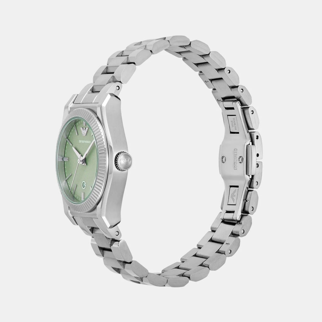 Emporio Armani's 32 mm watch features a striking mint green sunray dial, three-hand date movement, and a stainless steel bracelet. The fluted stainless steel bezel adds an element of visual intrigue, making the perfect complement to the structured watch case and bracelet