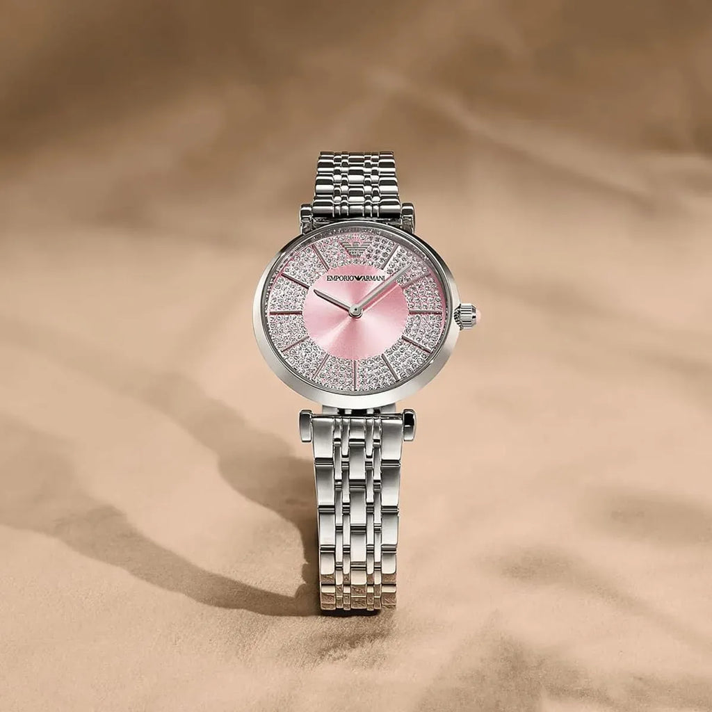 The AR11686 captivates with its classic yet contemporary design. The round stainless steel case in polished silver and the matching stainless steel bracelet create a harmonious overall impression. With a case diameter of 32 mm and a case height of just 8 mm, the watch elegantly hugs any wrist without being obtrusive. The dial, often in soft rose or mother-of-pearl tones, is refined with subtle indices and sparkling crystal stones that gently catch the light with every movement. This gives the watch a subtle yet glamorous allure.