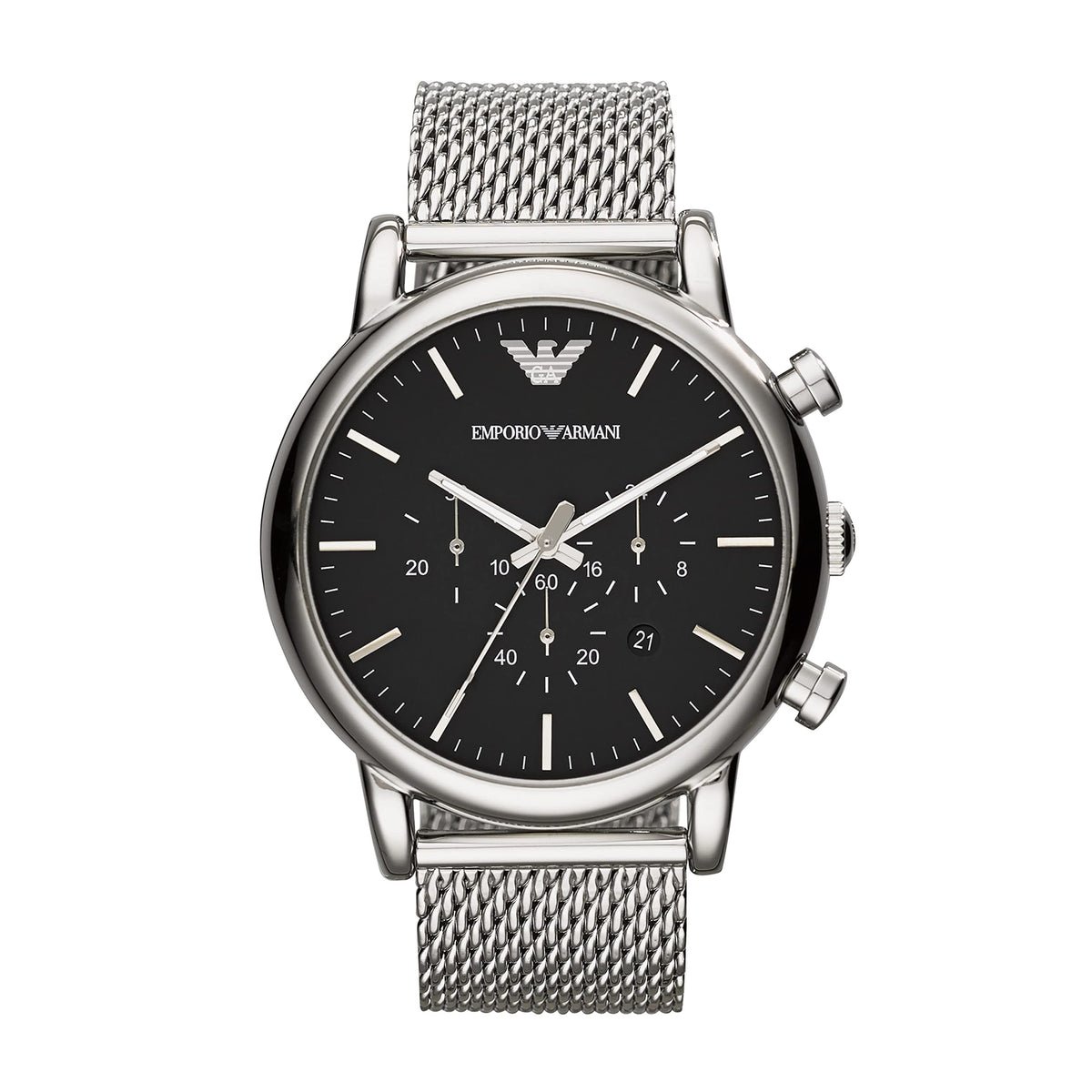 This aviator-inspired men’s Emporio Armani watch is handsomely equipped with a polished stainless-steel case, domed crystal lens, rounded lugs, black sunray chronograph dial and brushed-and-polished stainless-steel mesh bracelet.