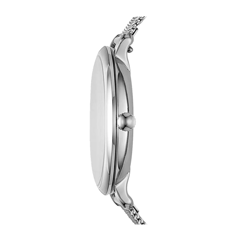 Solid case back. Round case shape, case size: 36 mm, case thickness: 8 mm. Band width: 14 mm. Water resistant at 30 meters / 100 feet. Functions: date, hour, minute, second. Dress watch style. Fossil Jacqueline Blue Mother of Pearl Dial Ladies Mesh Watch ES4322.