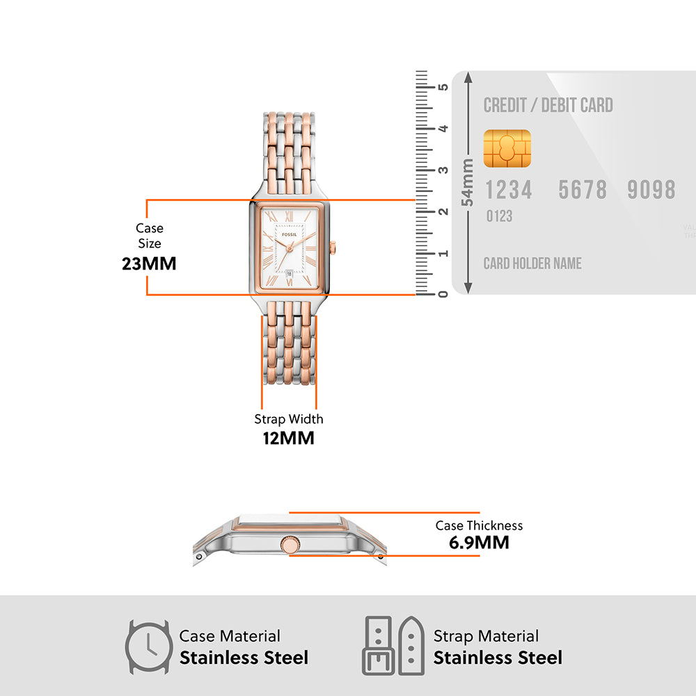 Experience timeless elegance with the Fossil Raquel Watch for women. This beautifully designed timepiece features a white dial and two-tone steel strap for a classic and versatile look. With its three-hand movement, stay stylish and on time wherever you go. Perfect for any occasion, this watch is a must-have accessory for any fashion-forward woman.
