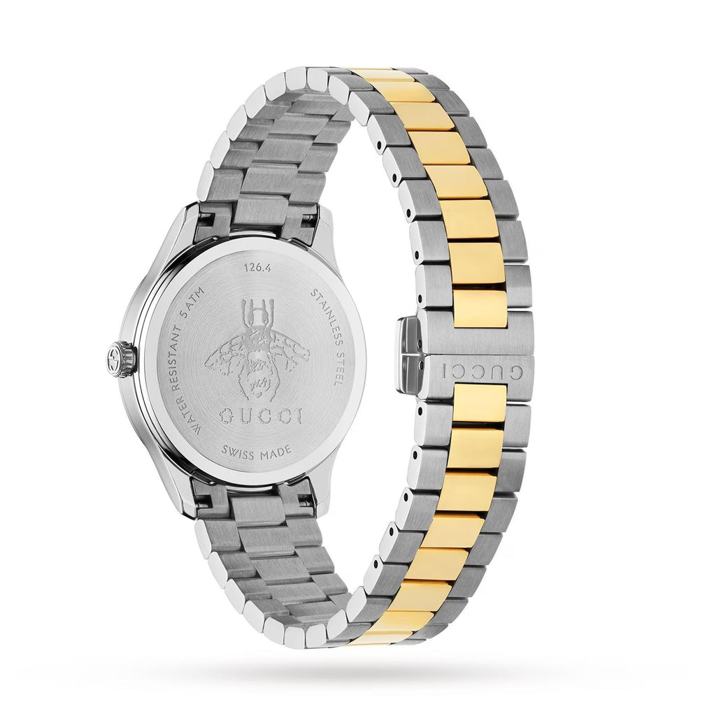 The Gucci G Timeless watch combines luxury and elegance in a sophisticated two-tone design. Featuring an 18K gold case paired with a polished steel strap, this timepiece delivers timeless appeal for the modern woman. The silver dial showcases clean, refined aesthetics that complement any occasion—from everyday wear to special events. Crafted with Gucci's signature attention to detail, the G Timeless collection represents the brand's heritage of Italian craftsmanship and enduring style. A statement piece that transcends trends, this watch is an investment in classic beauty and quality that lasts.