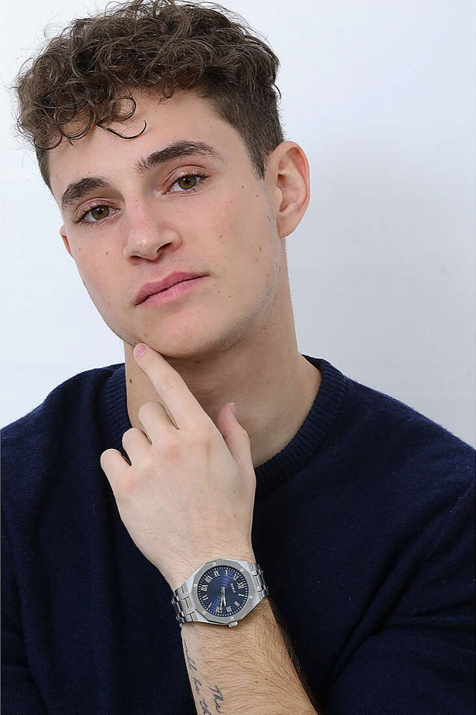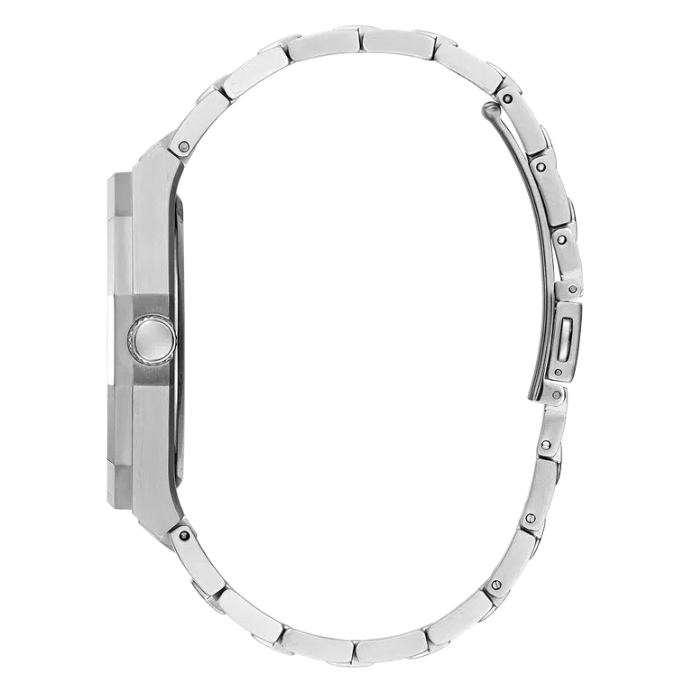 An asset to any man's wardrobe, this stunning octagonal case design with screw details features an upscale dial design with roman numerals and a brushed and polished bracelet.