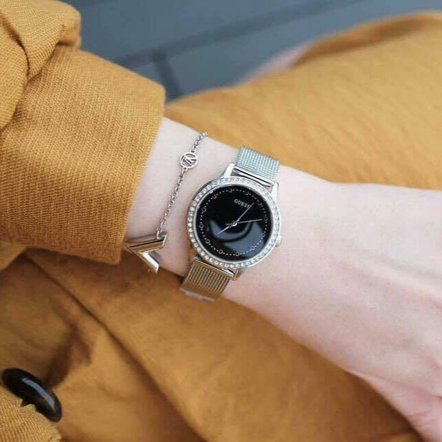 Guess Chelsea Crystals Black Dial Silver Mesh Bracelet Watch For Women - W0647L5