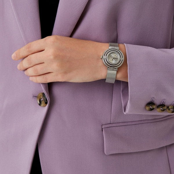 Sparkle and shine with this stunning women's watch from Guess. Part of the Dream collection, its one-of-a-kind case design adds a touch of elegance to any formal occasion or outfit. The shimmering crystals make a statement on any wrist. Crafted with high-quality steel and mineral glass, powered by a precise quartz mechanism. The diameter is 32 mm and the mesh chain is 14 mm wide. Water resistant up to 3 ATM - perfect for light splashes, but not recommended for full submersion.