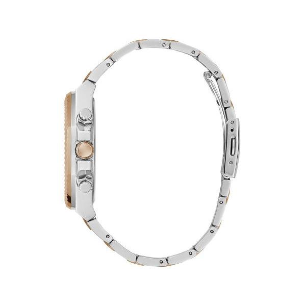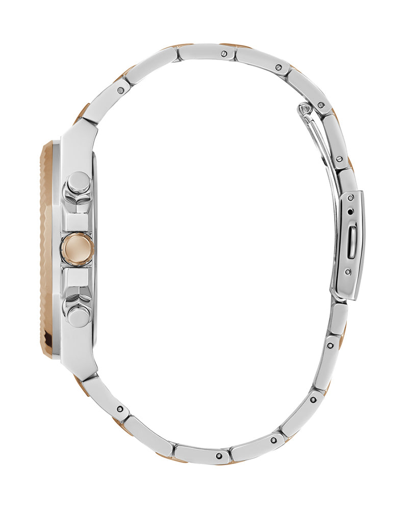 With a touch of class and the added feature of functionality with this silver and rose gold Guess Equity Black Link GW0703G4 watch. Constructed with recycled steel, this gent’s watch features a quartz analogue movement for precise timekeeping.