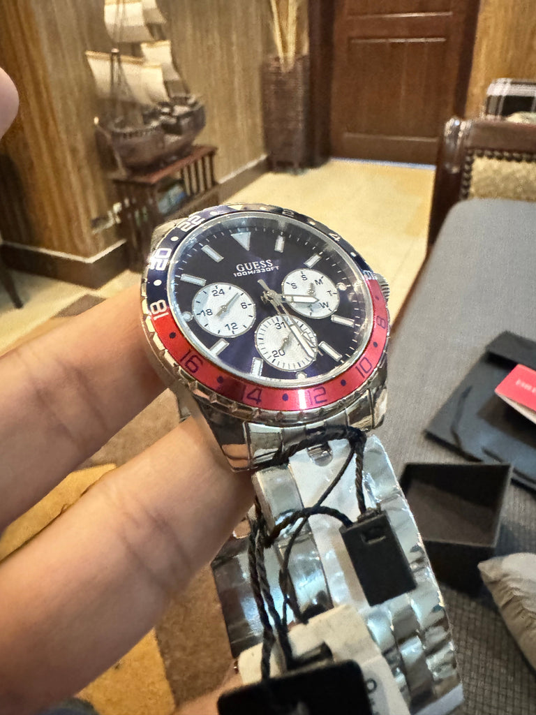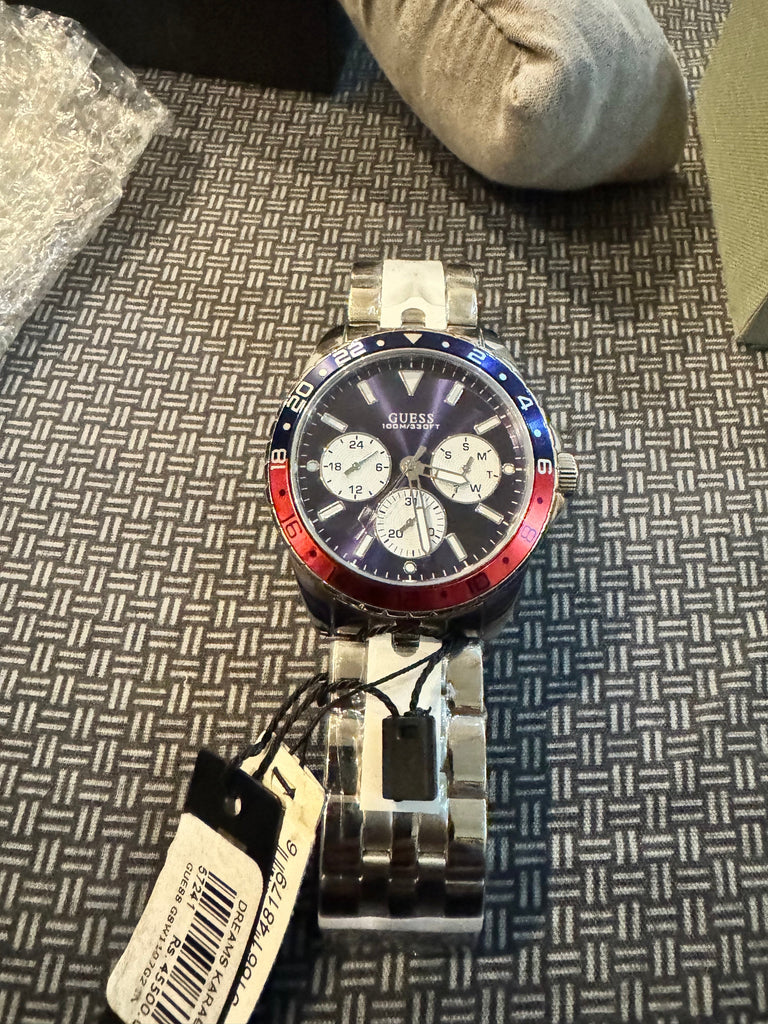 GUESS Gents watch featuring a brushed and polished silver case with blue and red aluminum trim, sunray blue multifunctional dial and brushed and polished silver bracelet.