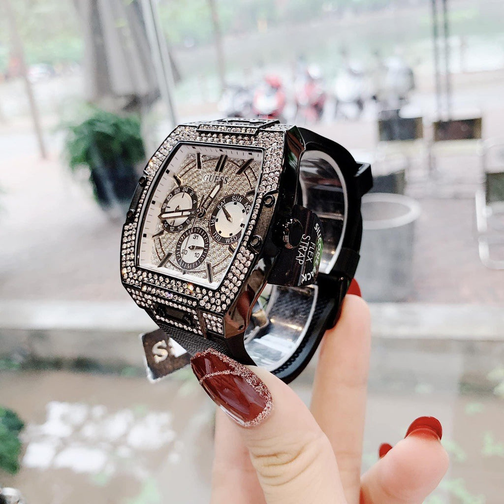 Guess Phoenix multifunction men's watch GW0048G1 with multifunction quartz movement with 24-hour and day of the week indicator, its 42 mm rectangular steel case with stones on the bezel and a silicone strap with buckle closure.