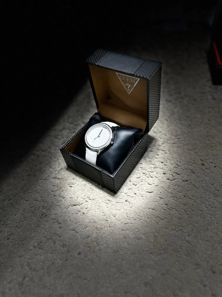 A feminine, pretty and incredibly elegant watch by Guess, this design for ladies features a polished stainless steel case with a diamante embellished bezel. The sleek strap is white leather and the round dial is also white with a striking pearlised rose feature and has three hand movement. The Guess logo is demurely displayed at the top centre of the dial.