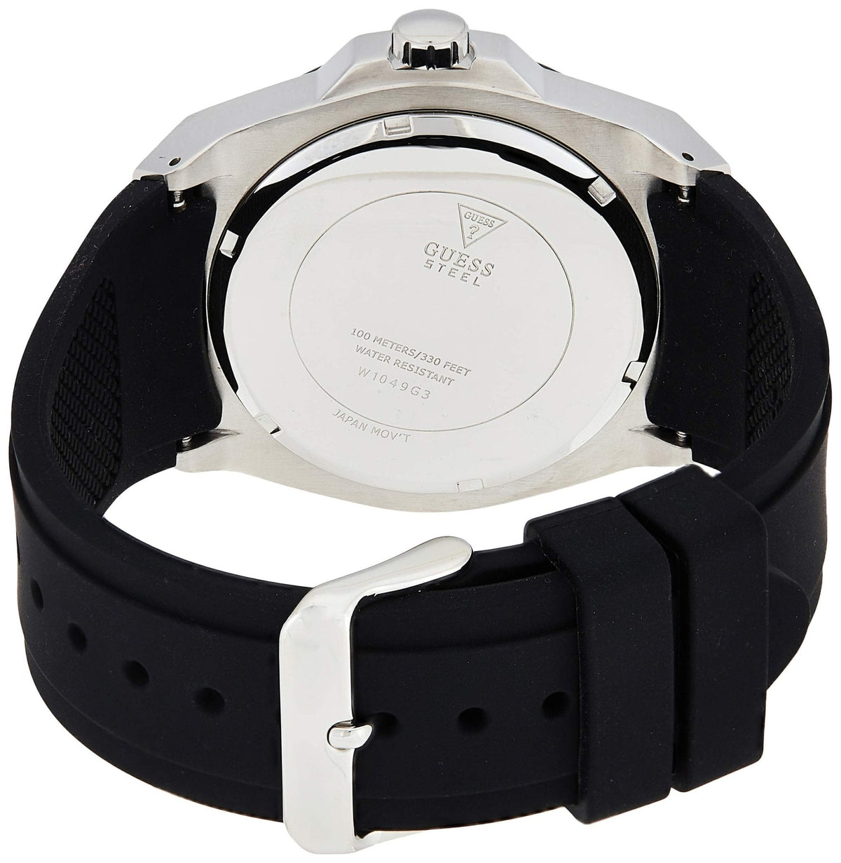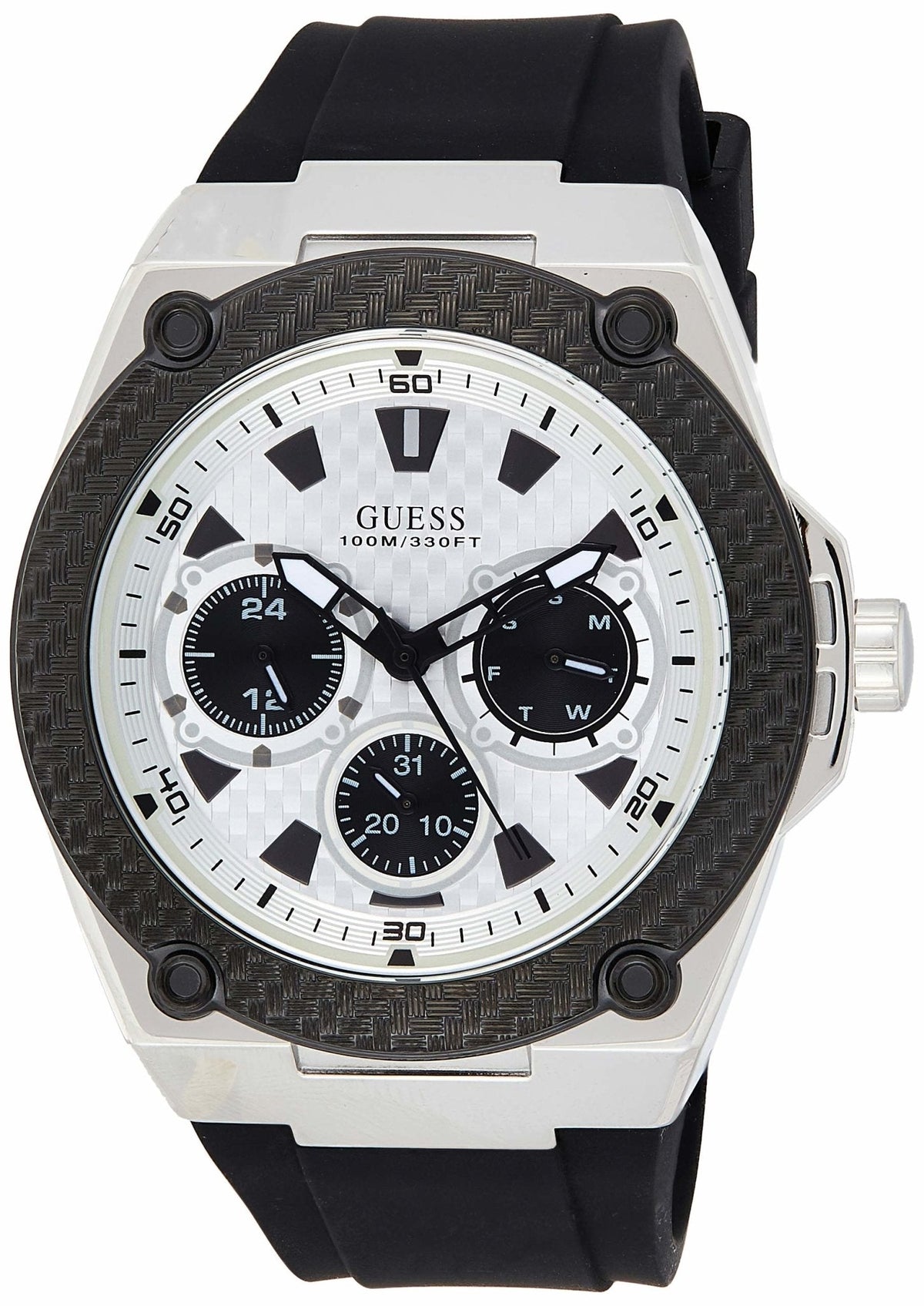 GUESS Legacy Men’s Watch Stainless steel case with a black rubber strap. Fixed black bezel. White dial with luminous black hands and index hour markers. Minute markers around the outer rim. It is shipped with its original box and official warranty card.