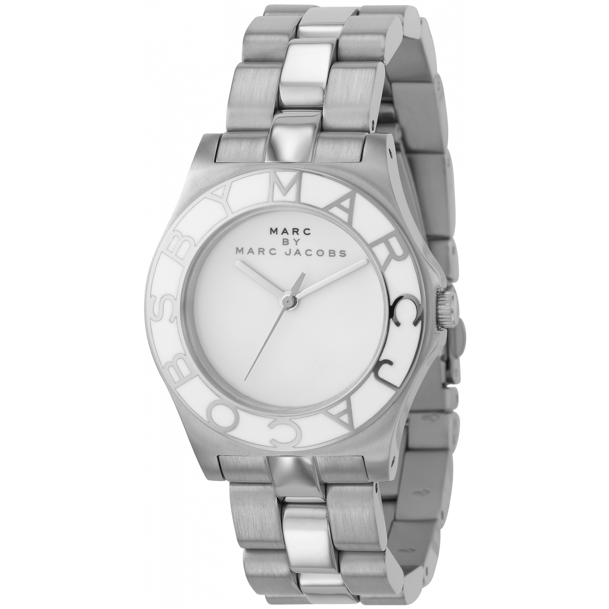 An ultra glamorous and highly on trend Marc by Marc Jacobs ladies watch, this design features a brushed stainless steel case with the Marc by Marc Jacobs lettering logo positioned around the bezel. The bracelet strap comprises of brushed stainless steel outer links and polished inner links for added depth and texture. The round dial is white with silver accents, has three hand movement and also displays the Marc by Marc Jacobs logo.