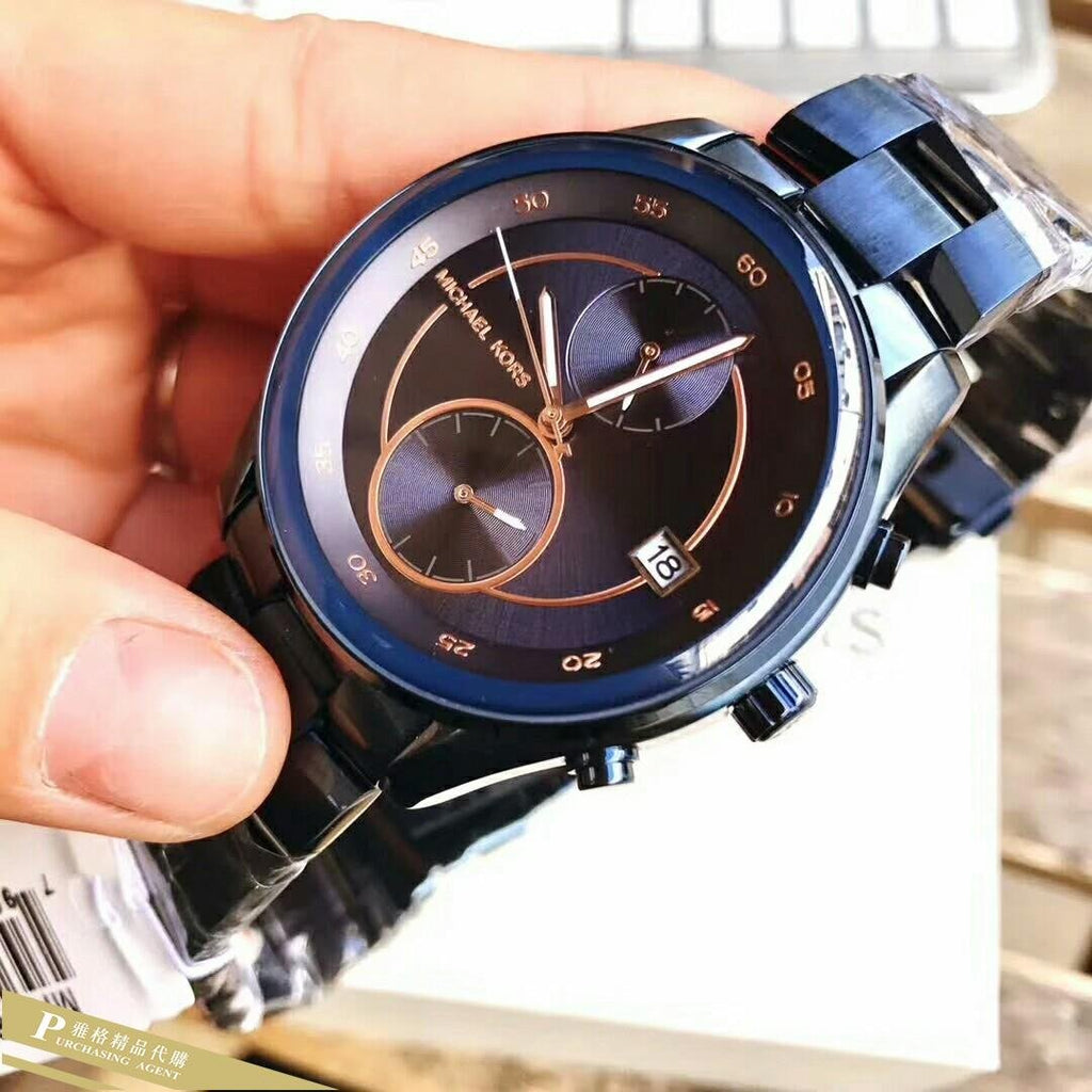 Navy blue ion plated stainless steel case with a navy blue ion plated stainless steel bracelet. Fixed navy blue stainless steel bezel. Navy blue dial with rose gold-tone hands and index hour markers. Minute markers around the outer rim. Dial Type: Analog. Date display at the 3 o'clock position. Quartz movement. Scratch resistant mineral crystal. Solid case back. Case size: 40 mm. Case thickness: 11 mm. Round case shape. Band width: 20 mm. Water resistant at 50 meters / 165 feet. Functions: date, hour, minute, second. Dress watch style. Michael Kors Briar Navy Blue Dial Ladies Multifunction Watch MK6468.