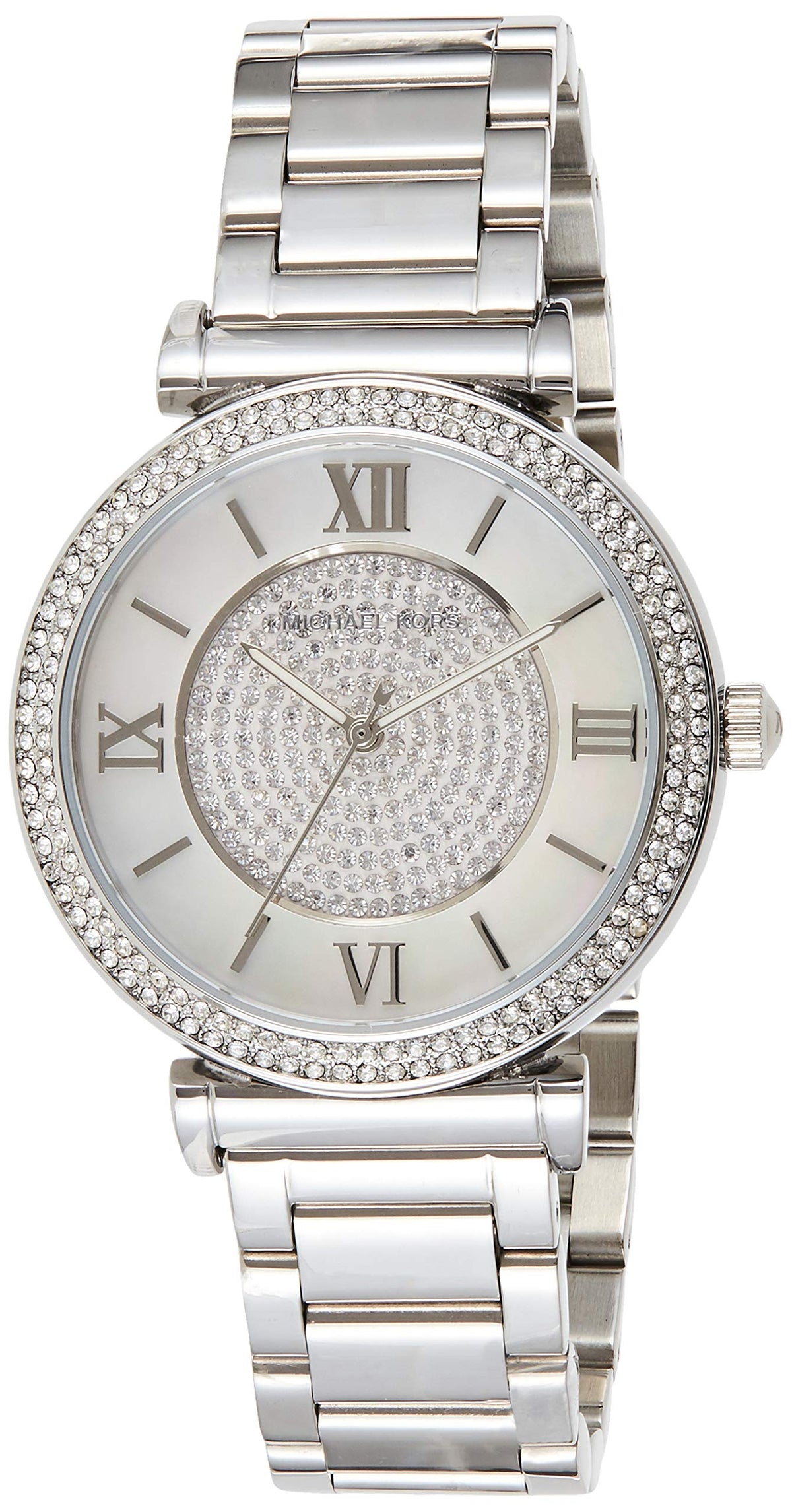 Functional and fashionable, it helps to make a sophisticated statement. It comes with a stainless steel case with a stainless steel bracelet. Fixed stainless steel bezel. Silver crystal paves dial with silver-toned hands and index hour markers. Quartz movement. Scratch-resistant mineral crystal. Push / pull crown.Round case shape. Ladies Catlin Bracelet Silver Stainless Steel Chronograph Micheal Kors Watch MK3355 Stainless Steel Bezel Silver Crystal Paves Dial Silver-Toned Hands Stainless Steel Case