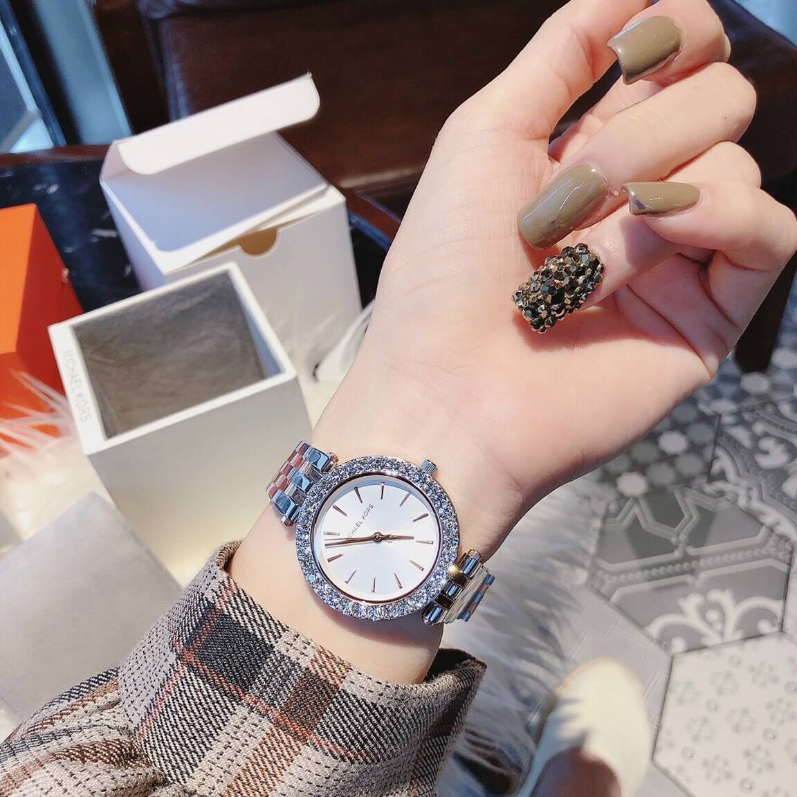Michael Kors Darci 35mm watch features a silver sunray dial with rose gold-tone stick indexes, oversized glitz along the topring, three-hand movement and stainless steel bracelet with rose gold-tone center links.