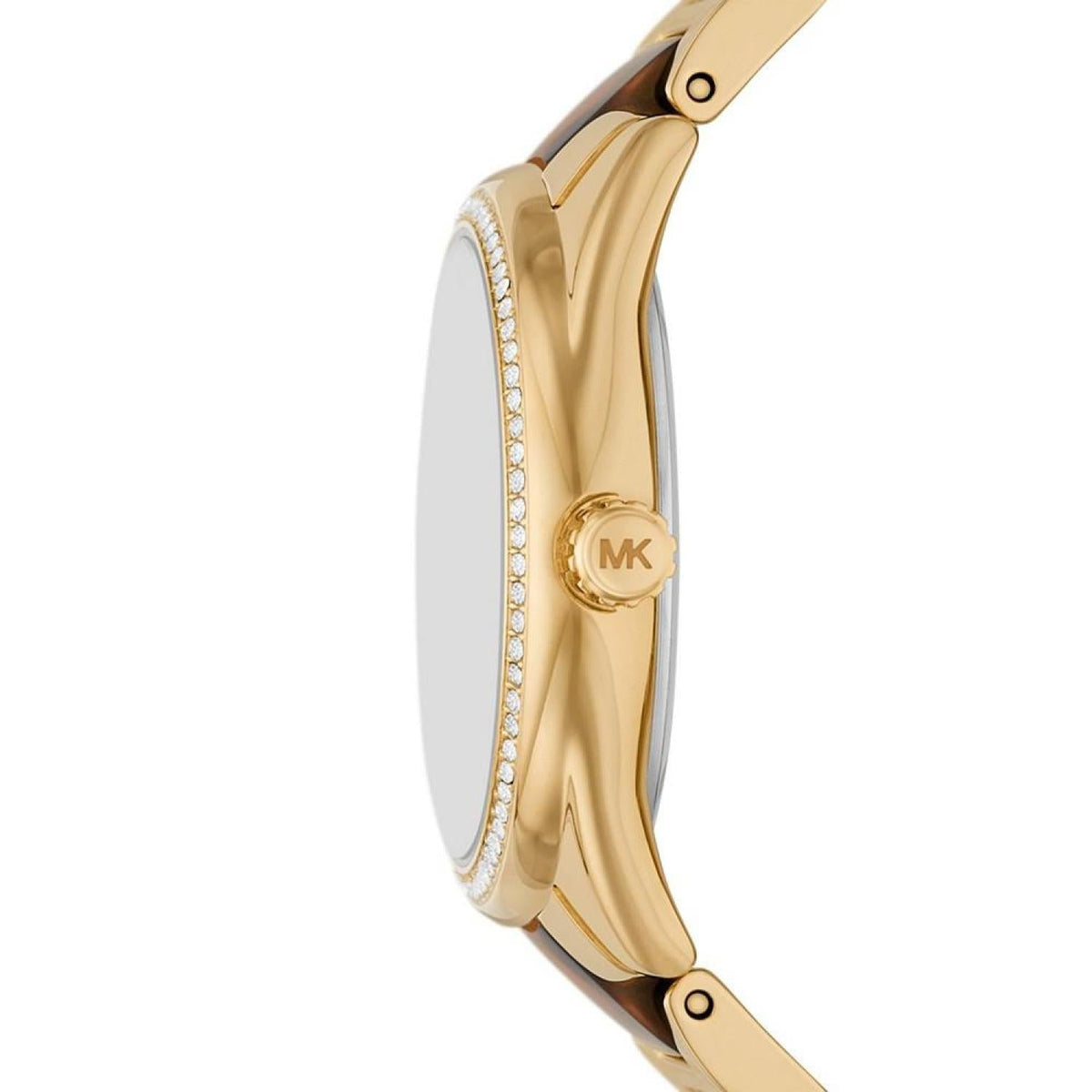Featuring durable stainless steel construction with a luxurious gold finish and loads of shimmering crystals on the dial & bezel, this women's 36mm 'Janelle' watch from Michael Kors is sure to impress. The sparkling Pavé crystal dial boasts a 3-hand movement and a large 'MK' logo at the center for a fashionable look. Plus, it's fitted with a gold stainless steel bracelet with brown faux tortoise acetate center links for a distinctive look.