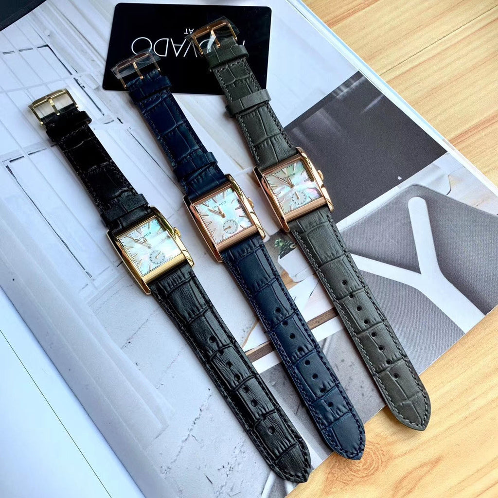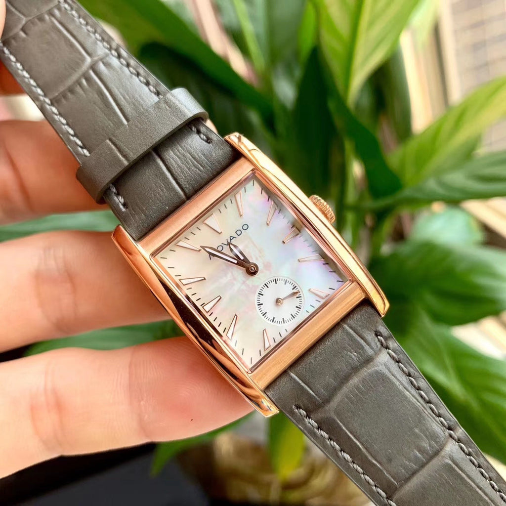 Rose gold PVD stainless steel case with a grey leather strap. Fixed rose gold PVD bezel. White mother of pearl dial with rose gold-tone hands and index hour markers. Minute markers around the outer rim. Dial Type: Analog. Luminescent hands and markers. Small second sub-dial. Quartz movement.Scratch resistant sapphire crystal. Pull / push crown. Solid case back. Rectangle case shape. Case dimensions: 28 mm x 30 mm. Case thickness: 7.5 milli. Band width: 25 mm. Tang clasp. Water resistant at 30 meters / 100 feet. Functions: hour, minute, small second. Luxury watch style. Watch label: Swiss Movt. Movado Heritage White Mother of Pearl Dial Ladies Watch 3650051.