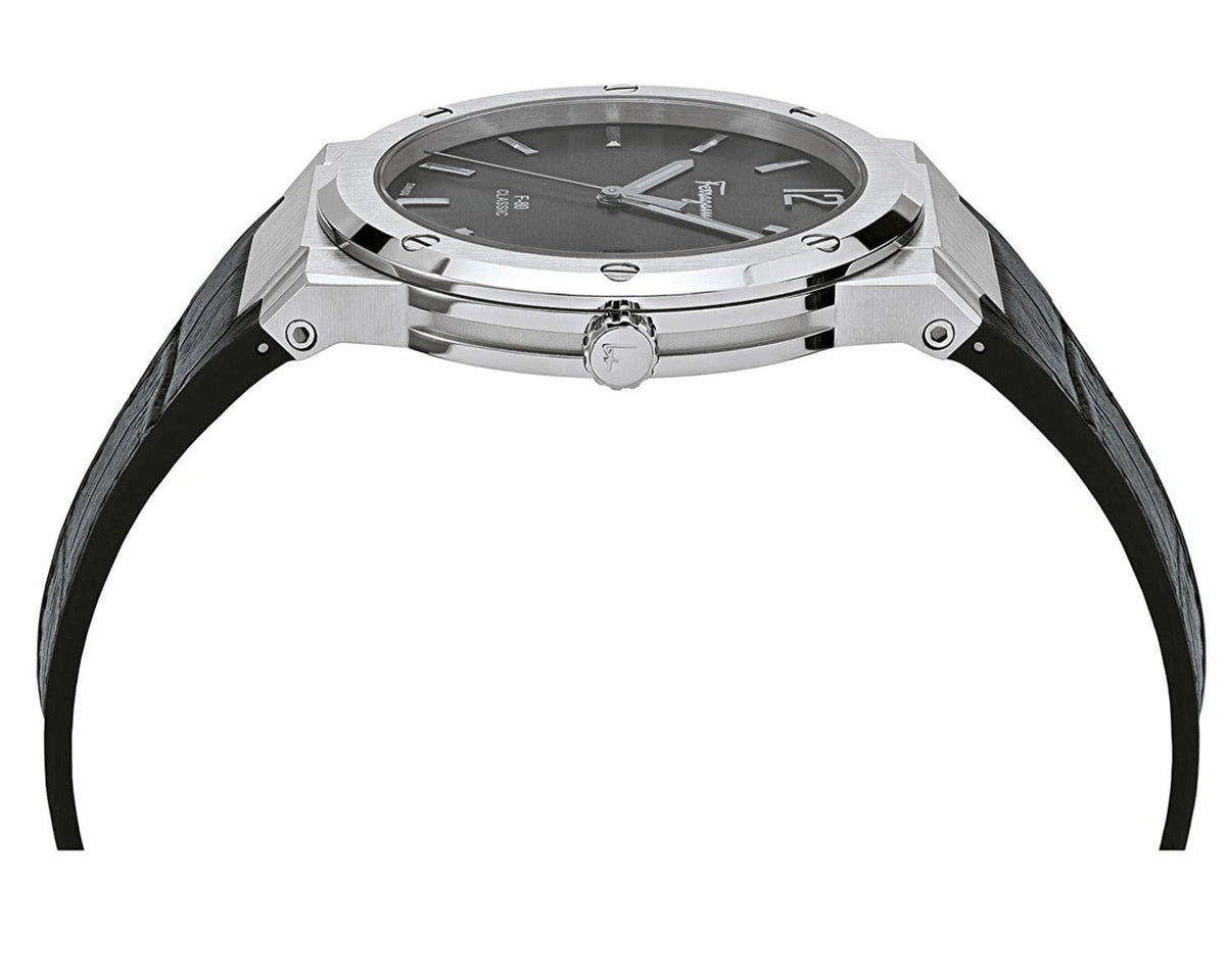 Ferragamo's ever-popular F-80 timepiece is a sport luxury staple with a slimmed-down stainless steel case and embossed black leather strap.
