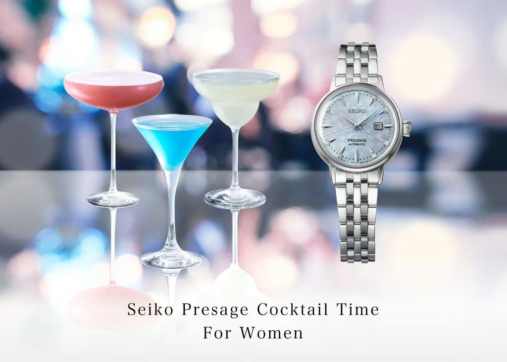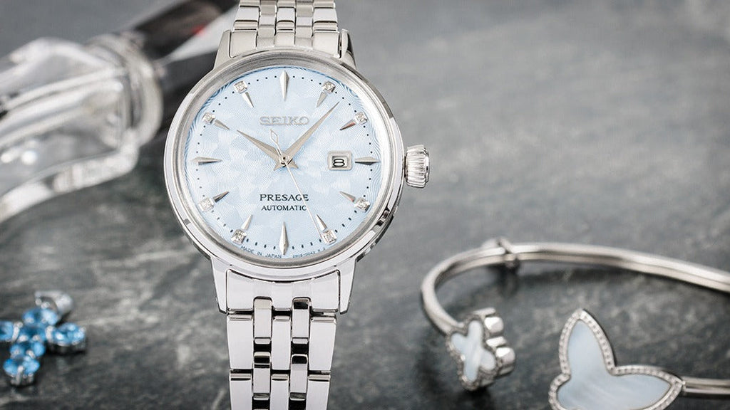 The Presage Cocktail Time collection, inspired by Tokyo's Ginza and its cocktail culture. In the tradition of 'Nomunication hour,' Seiko's Presage Cocktail Time watches draw inspiration from cocktails crafted by Hisashi Kishi, head bartender at Tokyo's Star Bar in Ginza. This timepiece features a textured dial inspired by the 'Skydiving' cocktail's blue hue, adorned with eight diamonds. The watch in-houses 2R05 calibre automatic movement with manual winding including box-shaped hardlex glass.